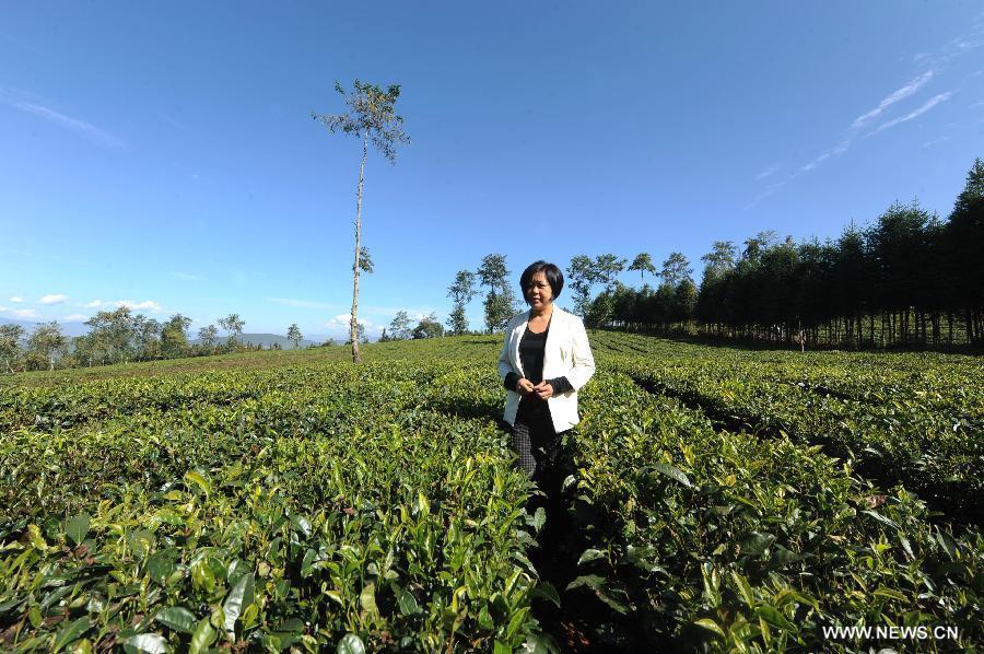 Chen Yazhong, chairwoman of the Gaoligongshan Tea Company, inspects the tea garden in Tengchong County, southwest China's Yunnan Province, Oct. 28, 2012. The ecological tea, a major product of Chen's company, created income of 126 millon yuan (20.2 million U.S. dollars) for local tea farmers last year. (Xinhua/Qin Qing)