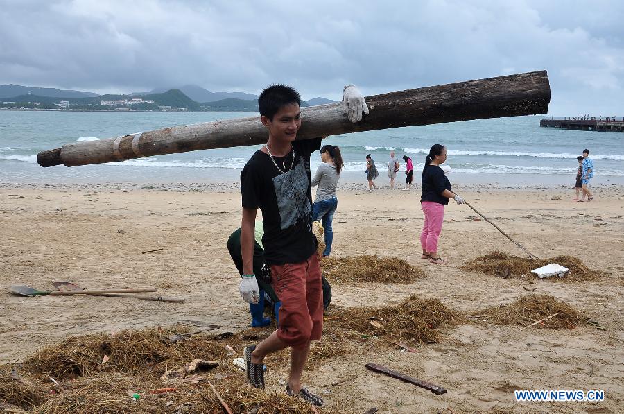 People clean the damaged equipments on the shore after Typhoon Son-Tinh swept Hainan island in Sanya City, south China's Hainan Province, Oct. 29, 2012. Typhoon Son-Tinh has slashed the province since Saturday, leaving one person dead and five others missing. A total of 1.26 million people in Hainan have been affected. (Xinhua/Guo Laijun)