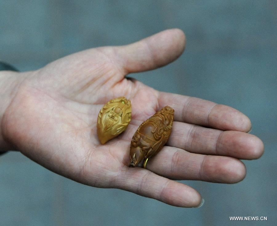 A technician presents walnut sculptures in Houliuwuying Village of Yongqing Couty, north China's Hebei Province, Oct. 29, 2012. Over 80 percent villagers in Houliuwuying make a living by walnut sculpture, which brings more than 30 million yuan (about 4.8 million U.S. dollars) of income to the village annually. (Xinhua/Wang Xiao)