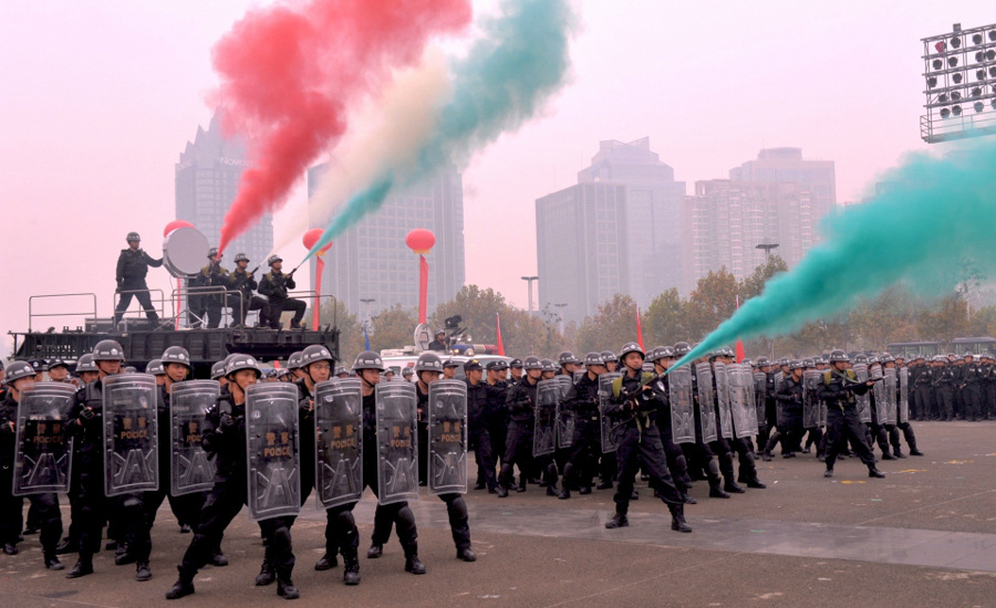 More than 2,000 police officers take part in anti-crime exercises before the 18th National Congress of the Communist Party of China, in Zhengzhou city, capital of Central China's Henan province, Oct 30, 2012. The exercise was jointly held by 18 police departments from 18 cities in Henan. The meeting will be convened on Nov 8, with more than 2,000 CPC delegates. [Photos/Asianewsphoto]