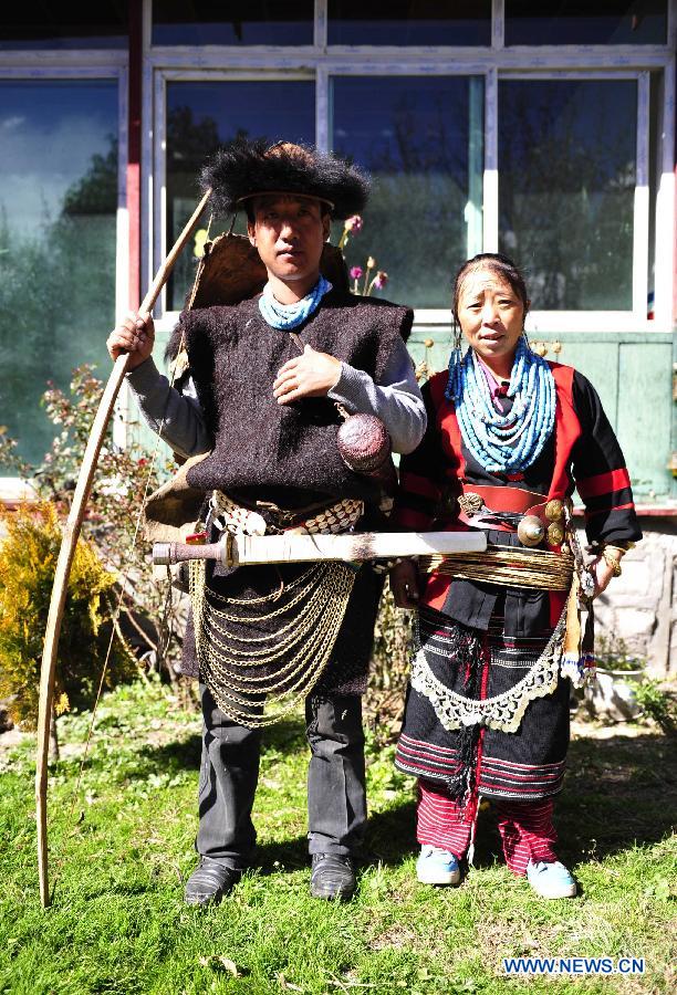 Residents of Lhoba ethnic group present their traditional costumes in Nyingchi, southwest China's Tibet Autonomous Region on Oct. 30, 2012. The Lhoba costume has been listed as China's intangible cultural heritage. (Xinhua/Liu Kun)