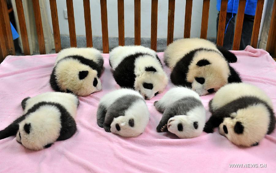 Seven giant panda cubs that were recently born sleep while meeting with the public at the Chengdu Research Base for Giant Panda Breeding in Chengdu, capital of southwest China's Sichuan Province, on Nov. 1, 2012. The research base showed the public on Thursday seven of the eight giant pandas that it breeded this year. (Xinhua/Cai Kai)