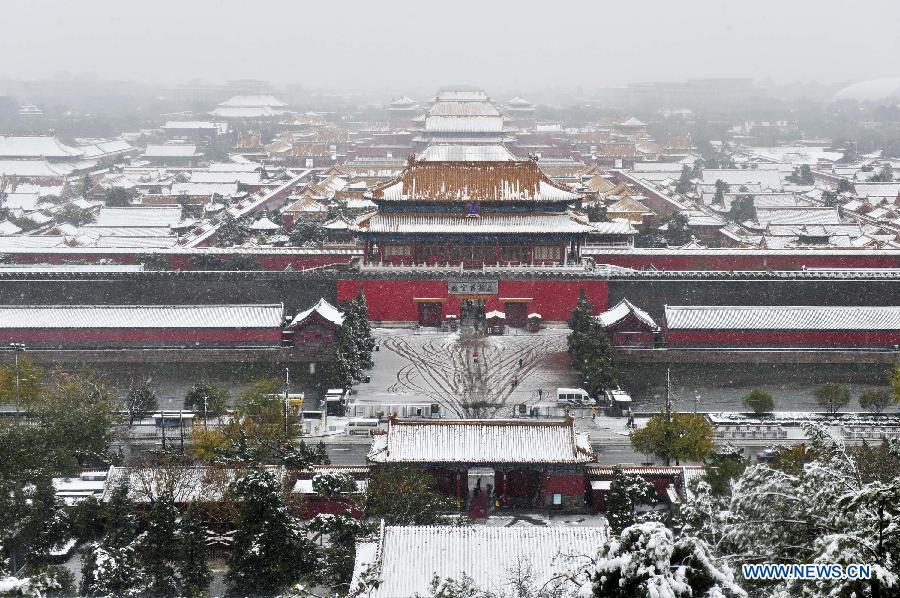 House roofs of the Palace Museum are covered by snow in Beijing, capital of China, on Nov. 4, 2012. The capital city had witnessed snowfall and sleet since Saturday night as cold current swept north China and dropped temperature. Local meteorological authorities issued an orange alert of blizzard, the second-highest level of the four-tier color-coded warning system on snowstorms. (Xinhua/Wang Jingsheng)