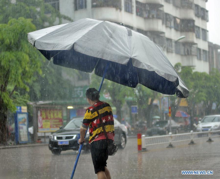 A citizen walks against the heavy rain under a folding umbrella in a street of Qionghai City, south China's Hainan Province, Nov. 6, 2012. Rainy weather appeared in some places of Qionghai City on Tuesday. (Xinhua/Meng Zhongde)