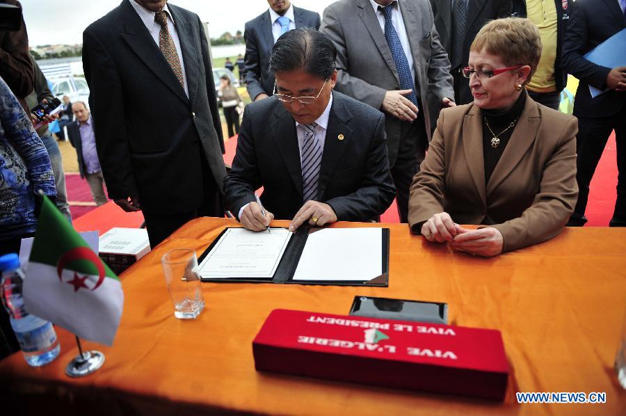 Chinese Ambassador to Algeria Liu Yuhe (L) and Algerian Minister of Culture Khalida Toumi sign a document on the foundation stone laying ceremony of the Opera House of Algeria in Ouled Fayet suburbs in western Algiers, Nov. 5, 2012. The 1,400-seat opera house will be built in an area of 40,000 square meters in Ouled Fayet suburbs during the 24-mouth project construction period. (Xinhua/Mohamed Kadri)