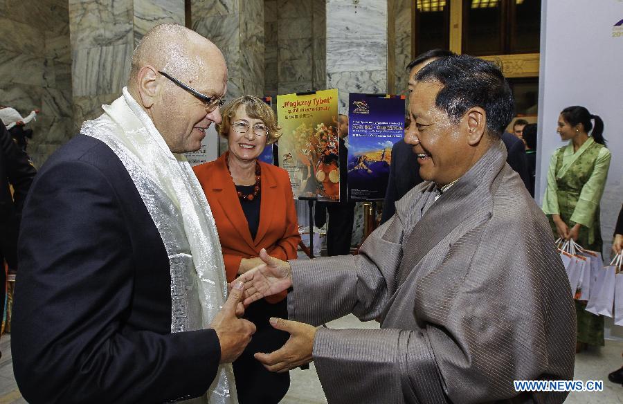 Vice president of China's Tibet Automous Region Duo Tuo (R) talks with a guest during the opening ceremony of 2012 Poland•China Tibetan Culture Week in Warsaw, capital of Poland, on Nov. 5, 2012. The 2012 Poland China Tibetan Culture Week opened here in Warsaw on Monday, aiming to give the Poles a glimpse of Tibet and its traditional culture. (Xinhua/Zhou Lei)