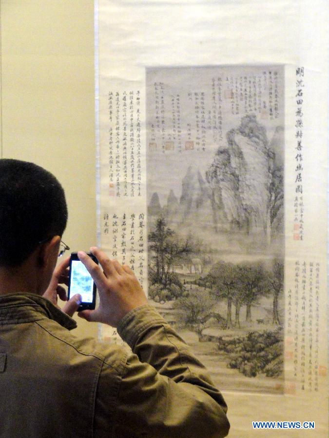 A visitor takes photos of ancient Chinese calligraphy and painting works at Suzhou Museum in Suzhou of east China's Jiangsu Province, Nov. 6, 2012. Gathered from 15 museums from home and abroad, 50 pieces of artworks of Shen Zhou were exhibited here. Shen Zhou, a famous painter from the Ming Dynasty (1368-1644), was famous for his landscape, flower-and-bird, figure and genre paintings. (Xinhua/Chen Yu)