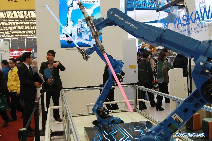 Visitors watch two industrial robots performing martial arts at the 2012 China International Industry Fair in east China's Shanghai Municipality, Nov. 6, 2012. The five-day Fair, which kicked off on Tuesday, is held in November annually since 1999. (Xinhua/Pei Xin)