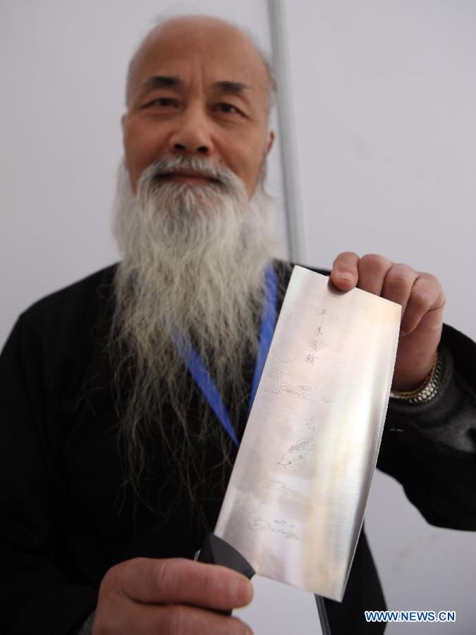 Qiu Bao'an, a knife and scissors maker based in east China's Zhejiang Province, presents a knife with engraved patterns at the China Huangshan Intangible Cultural Heritage Skills Exposition in Huangshan, east China's Anhui Province, Nov. 7, 2012. A total of 237 Chinese intangible cultural heritage items will be exhibited during the five-day event, which opened here on Wednesday. (Xinhua/Xu Zijian)