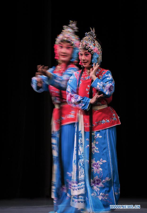 This multiple-exposure photo taken on Nov. 8, 2012 shows a Peking Opera performer from Taiwan performing Peking Opera "The Legend of the White Snake" during a rehearsal press conference in Taipei, southeast China's Taiwan. A three-day joint performance by Peking Opera performers from both Chinese mainland and Taiwan will be staged in Taiwan from Nov. 9 to 11. (Xinhua/Yin Bogu)