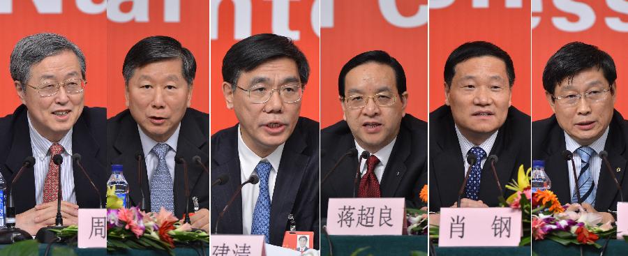 This combined photo shows (L-R) governor of the People's Bank of China Zhou Xiaochuan, chairman of the China Banking Regulatory Commission Shang Fulin, chairman of the board of the Industrial and Commercial Bank of China Jiang Jianqing, chairman of the board of the Agricultural Bank of China Jiang Chaoliang, chairman of the board of the Bank of China Xiao Gang and chairman of the board of the China Construction Bank Wang Hongzhang at a group interview held by the press center of the 18th National Congress of the Communist Party of China (CPC) in Beijing, capital of China, Nov. 11, 2012. (Xinhua/Li Xin)