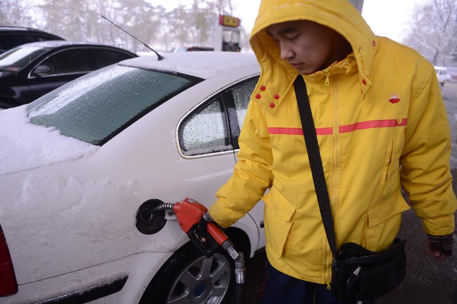 A staff member of a gas station refuels a car in Changchun, capital of northeast China's Jilin Province, Nov. 12, 2012. China will likely cut gasoline and diesel retail prices recently, as crude oil prices have dropped close to the price adjustment threshold, analysts said Saturday. The price cuts could be between 300 yuan (47.62 U.S. dollars) and 350 yuan per tonne. (Xinhua/Lin Hong)