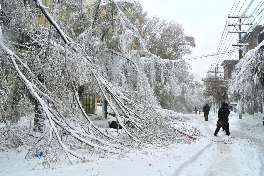 People walk on the snow-covered road in Hegang, northeast China's Heilongjiang Province, Nov. 12, 2012. Heavy snowstorms have cut off regional power and water supplies as well as forced schools and highways to close in northeast China's Heilongjiang and Jilin provinces on Monday. (Xinhua/Bao Hongsheng)