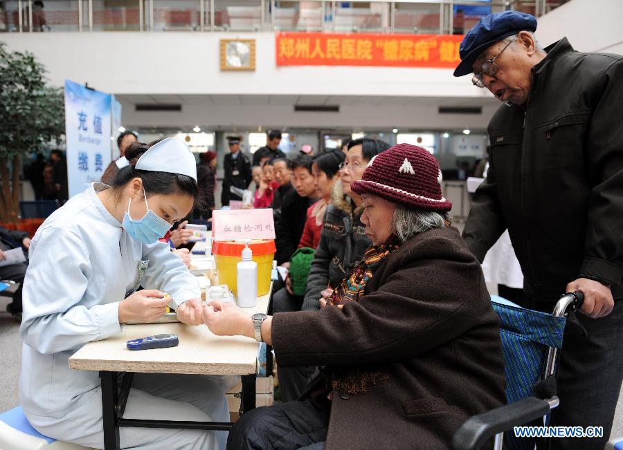 A nurse checks the blood glucose of a senior citizen during a free clinic service for diabetes in Zhengzhou, capital of central China's Henan Province, Nov. 14, 2012. An activity of free clinic service was held by Zhengzhou Renmin Hospital to welcome the World Diabetes Day on Wednesday. (Xinhua/Li Bo)