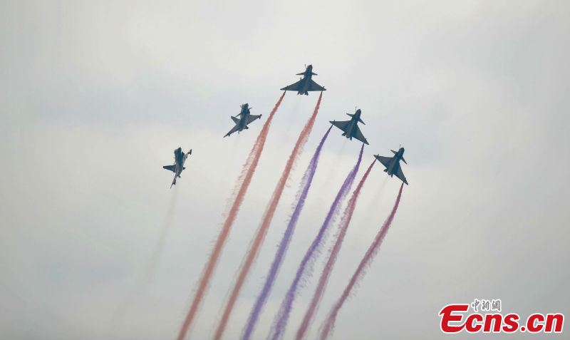 J-10 fighters from the August 1 Aerobatics Team of the Air Force of the Chinese People's Liberation Army (PLA) perform an air show during the 9th China International Aviation and Aerospace Exhibition in Zhuhai, South China's Guangdong Province, November 14, 2012. [Photo: CNS/Ke Xiaojun]