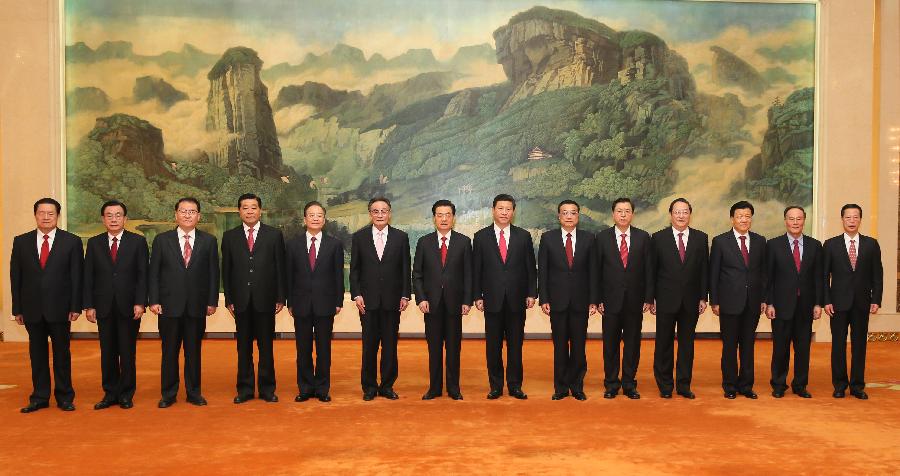 Chinese President Hu Jintao (7th L) and members of the Standing Committee of the Political Bureau of the 17th Communist Party of China (CPC) Central Committee Wu Bangguo (6th L), Wen Jiabao (5th L), Jia Qinglin (4th L), Li Changchun (3rd L), He Guoqiang (2nd L) and Zhou Yongkang (1st L) pose for a group photo with newly-elected General Secretary of the CPC Central Committee and Chairman of the CPC Central Military Commission Xi Jinping (7th R) and members of the Standing Committee of the 18th CPC Central Committee Political Bureau Li Keqiang (6th R), Zhang Dejiang (5th R), Yu Zhengsheng (4th R), Liu Yunshan (3rd R), Wang Qishan (2nd R) and Zhang Gaoli (1st R), in Beijing, capital of China, Nov. 15, 2012. (Xinhua/Ju Peng)