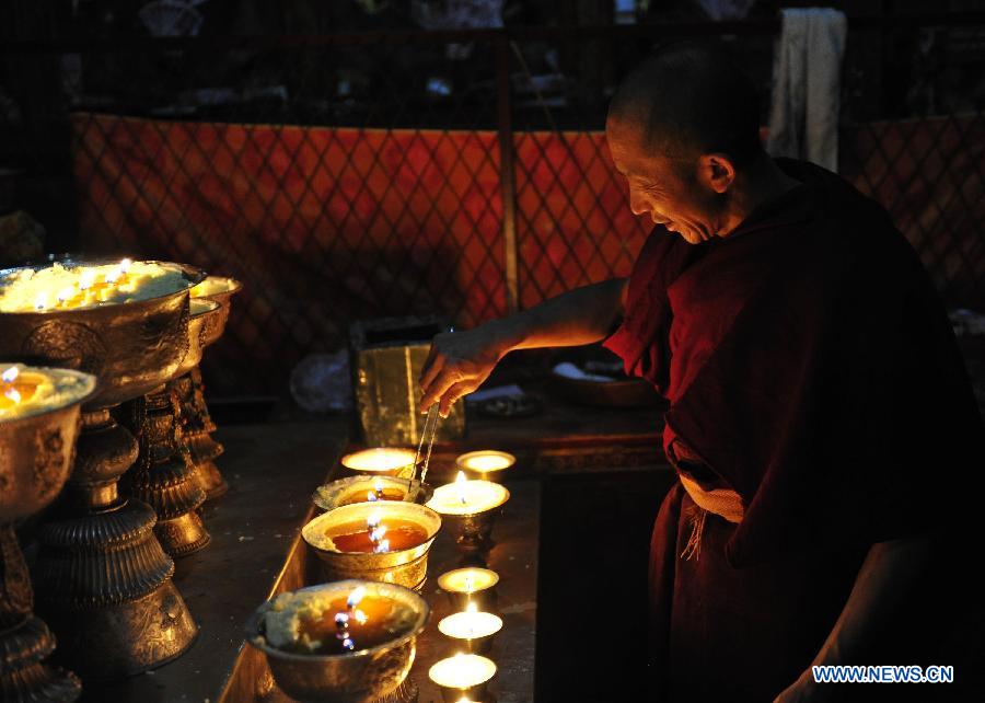 A monk is seen in the Shalu Monastry in Xigaze, southwest China's Tibet Autonomous Region, Nov. 15, 2012. Shalu Monastery was built in 1087 and restored in 1333 after the original structure was destroyed in an earthquake. (Xinhua/Liu Kun)