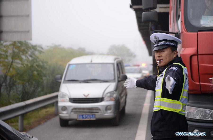 A traffic policeman directs traffic in the Changzhang section of the Shanghai-Kunming Highway in Nanchang, east China's Jiangxi Province, Nov. 19, 2012. The highways which closed because of dense fog in the province gradually reopened as the fog disappeared on Monday morning. (Xinhua/Zhou Mi)