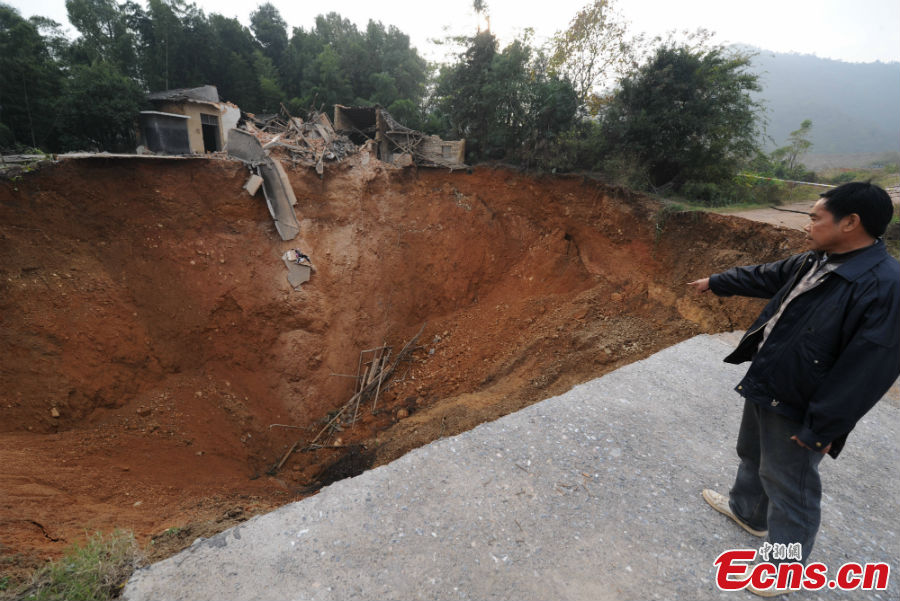 A deep hole is seen in Quanhong Village, Changsha, Central China's Hunan Province, November 19, 2012. The cave-in, about 200 square meters and 30 meters deep, engulfed a two-story house on November 17. [Photo: CNS/Yang Huafeng]