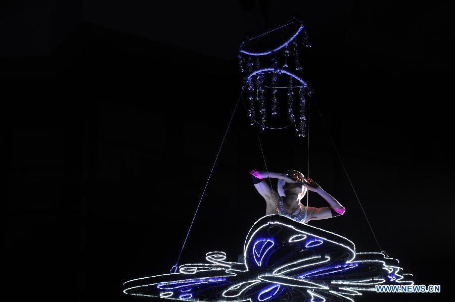 A dancer performs during a dancing show about the tradition of Miao and Dong ethnic groups in Kaili City of Qiandongnan, southwest China's Guizhou Province, Nov. 19, 2012. (Xinhua/Tao Liang)