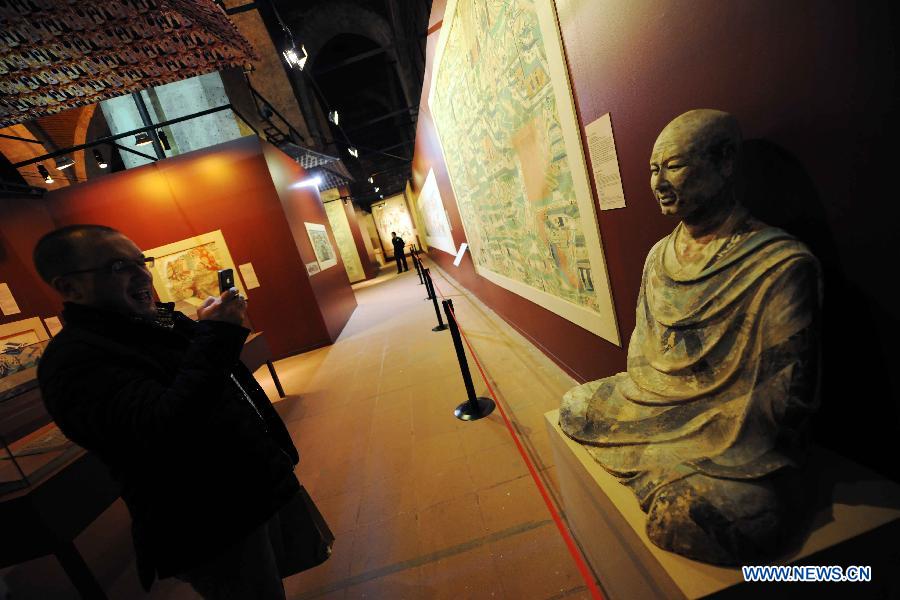 A visitor watches the duplicate of a statue at "The Colors of Dunhuang: A Magic Gateway to the Silk Road" exhibition held in Mimar Sinan University in Istanbul of Turkey, on Nov. 20, 2012. The Exhibition kicked off here on Tuesday. (Xinhua/Ma Yan)