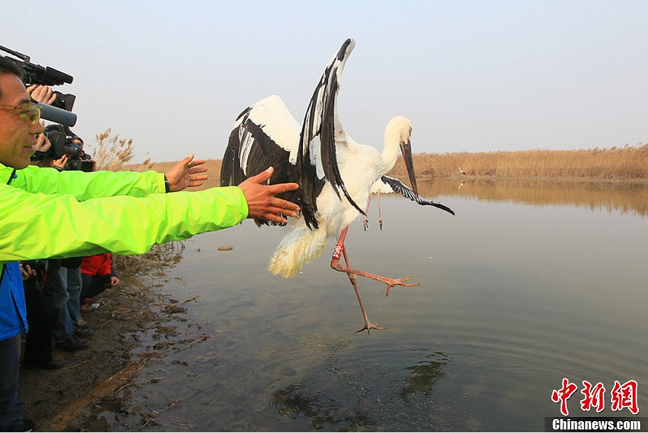 Altogether 13 oriental white storks nursed back to health after being poisoned by poachers are released into the wild at Beidagang Wetland Nature Reserve in Tianjin, November 21, 2012. Oriental white storks are listed as rare birds under first-grade State protection in China. The Beidagang Wetland is an important habitat along their migratory route. [Photo: CFP]