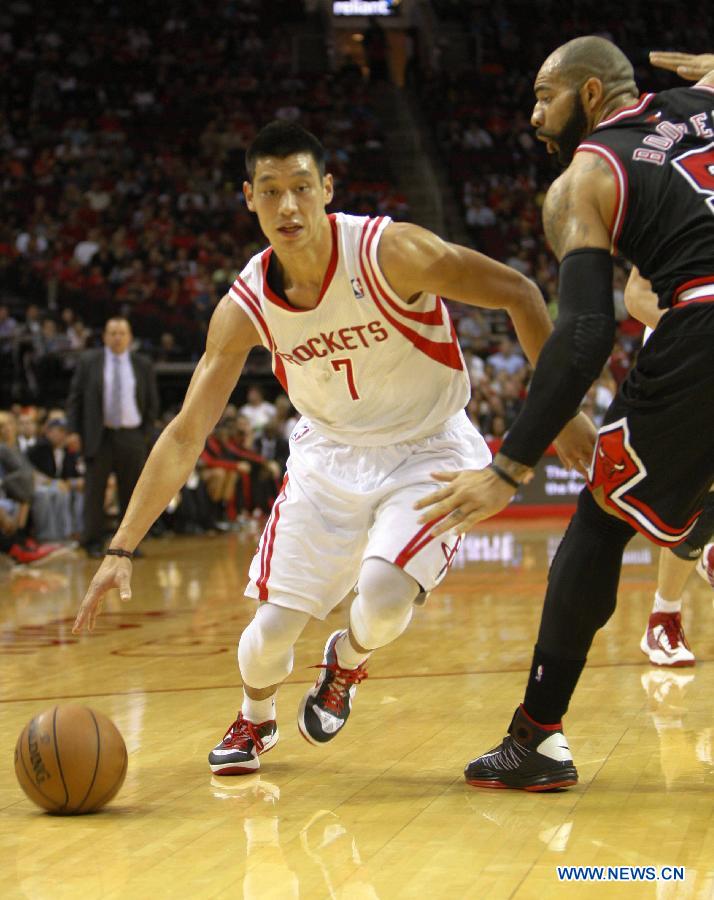 Jeremy Lin (L) of Houston Rockets drives the ball during the NBA game against Chicago Bulls in Houston, the United States, Nov. 21, 2012. (Xinhua/Song Qiong)