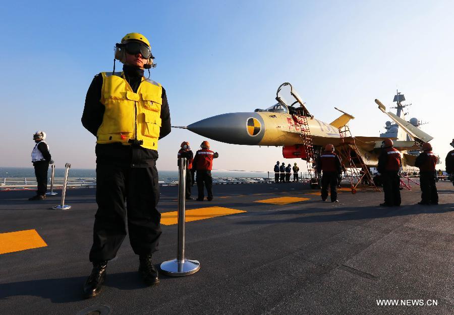 This undated photo shows staff members checking a carrier-borne J-15 fighter jet on China's first aircraft carrier, the Liaoning. China has successfully conducted flight landing on its first aircraft carrier, the Liaoning. After its delivery to the People's Liberation Army (PLA) Navy on Sept. 25, the aircraft carrier has undergone a series of sailing and technological tests, including the flight of the carrier-borne J-15. Capabilities of the carrier platform and the J-15 have been tested, meeting all requirements and achieving good compatibility, the PLA Navy said. Designed by and made in China, the J-15 is able to carry multi-type anti-ship, air-to-air and air-to-ground missiles, as well as precision-guided bombs. The J-15 has comprehensive capabilities comparable to those of the Russian Su-33 jet and the U.S. F-18, military experts estimated. (Xinhua/Zha Chunming)