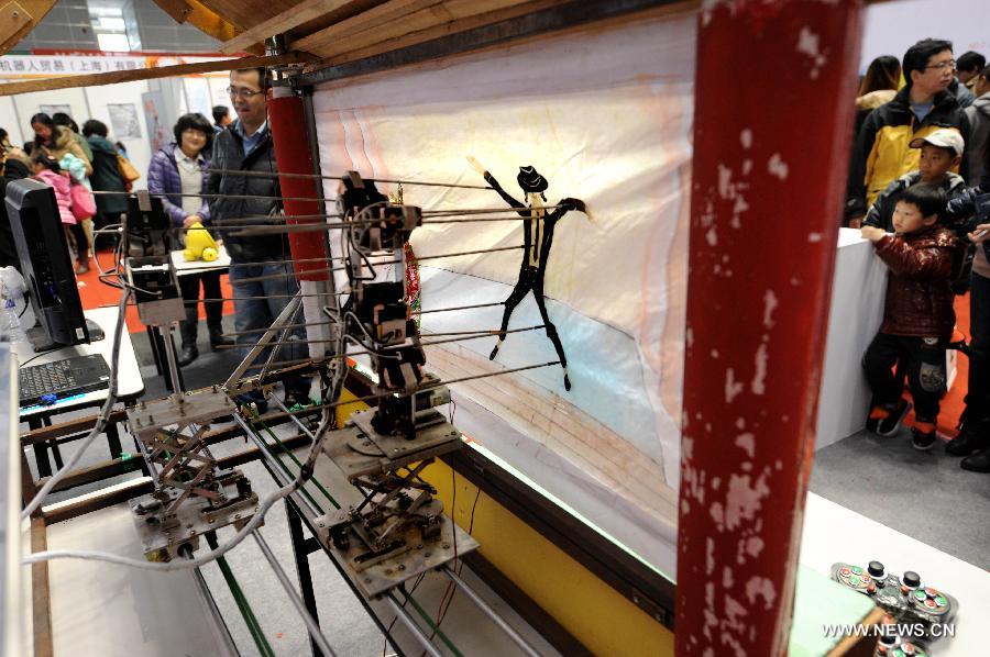 A robot performs shadow play during a robot show held in Qingdao University, Qingdao, east China's Shandong Province, Nov. 25, 2012. The robot show, the first kind of this exhibition in Shandong, showcased the latest achievement of robot-related technology, involving over 100 exhibits from home and abroad. (Xinhua/Li Ziheng)