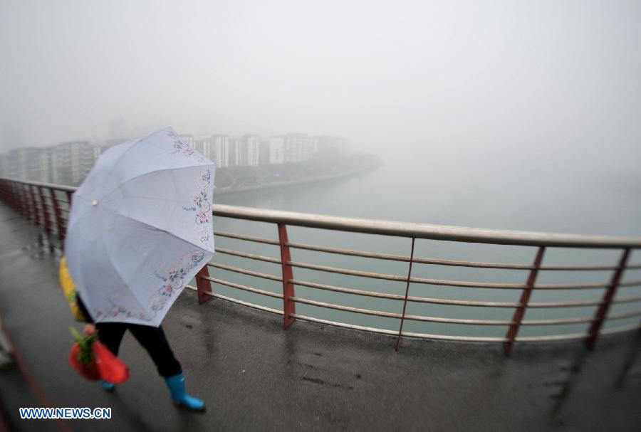 A citizen walks in the fog-shrouded Liuzhou City, southwest China's Guangxi Zhuang Autonomous Region, Nov. 25, 2012. (Xinhua/Li Hanchi)
