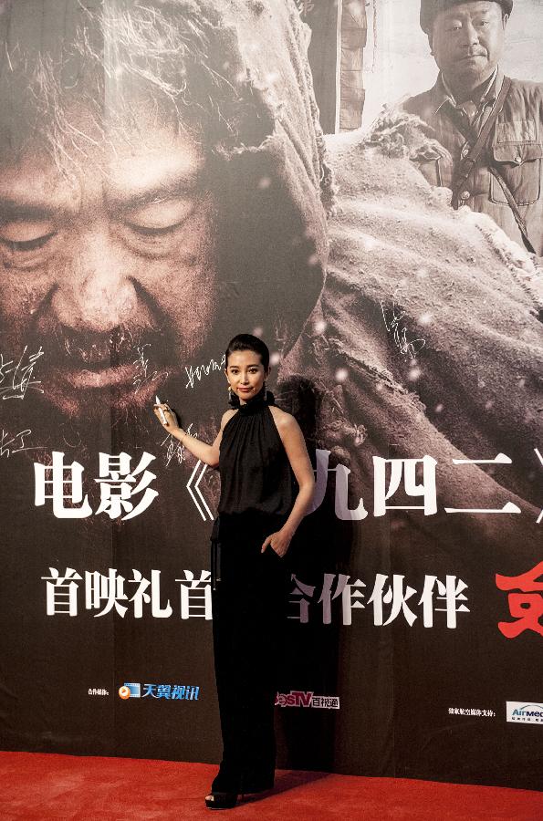 Chinese actress Li Bingbing poses on the red carpet for the premiere of the film "Back to 1942" at the National Stadium in Beijing, capital of China, Nov. 25, 2012. The film will be released on Nov. 29. (Xinhua/Zhang Yu)