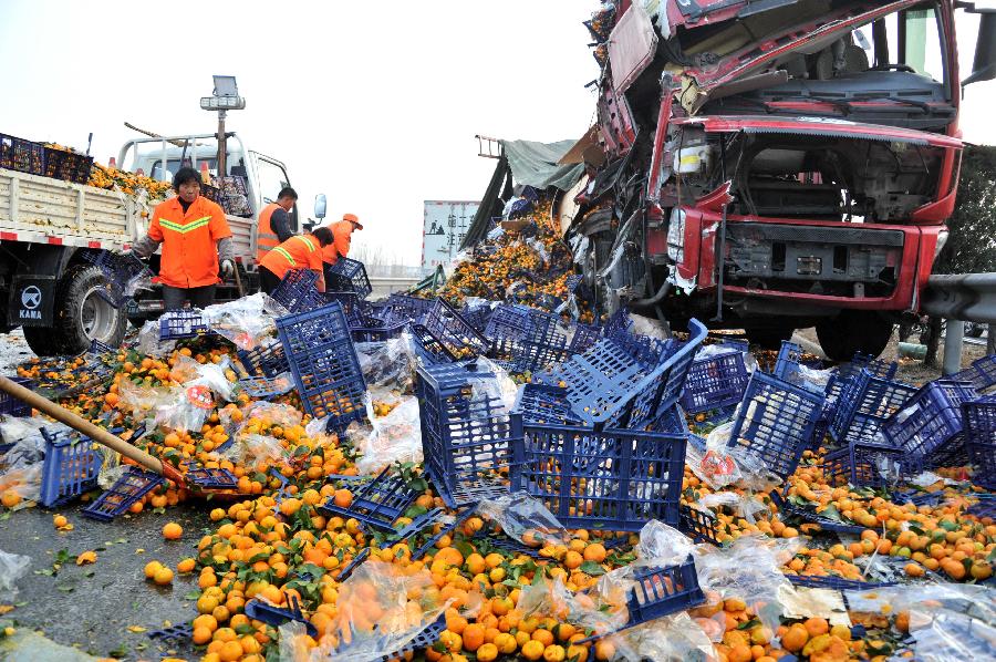 Cargoes are scattered at a traffic accident scene on the Tai'an section of the Beijing-Taipei Expressway in Tai'an, east China's Shandong Province, Nov. 26, 2012. Seven people died and 35 others were injured in at least 22 accidents on several sections of an expressway in Shandong Province amid heavy fog on Monday, local government officials said. Seven crashes occurred on the Tai'an section of the Beijing-Taipei Expressway early Monday morning, leaving one dead and eleven injured, while 15 crashes occurred on the expressway's Ningyang section, killing six and injuring another 24, the traffic police reported. By Monday afternoon, police said the expressways had reopened. (Xinhua/Xu Suhui)
