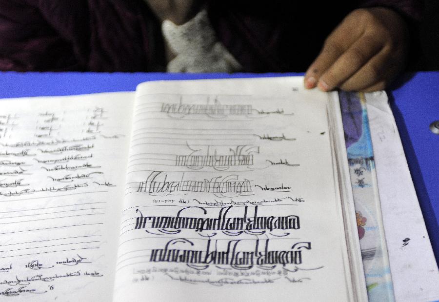 A student of Dhungker Language School demonstrates a piece of Tibetan handwriting exercise in Lhasa, capital of southwest China's Tibet Autonomous Region, Nov. 22, 2012. Since its establishment in 1997, Dhungker Language School has been an ideal choice for Tibetan language learners both at home and abroad. Students of the Lhasa-based civilian-run language training center consist mainly of non-native people seeking better communication with the locals and those who wish to delve into the Tibetan culture and Buddhist scriptures written in Tibetan. (Xinhua/Chogo)