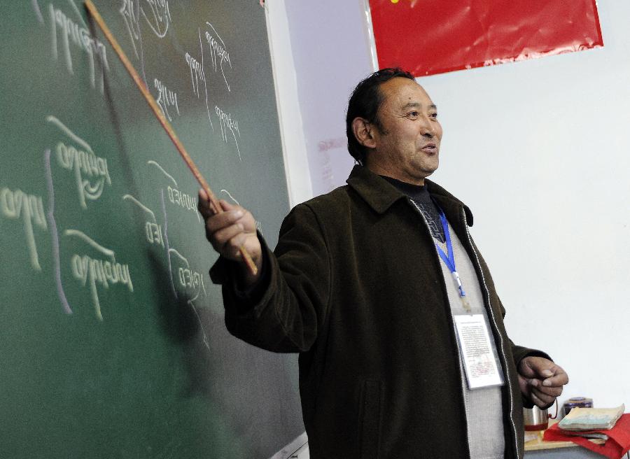 A teacher lectures on pronunciation during a Tibetan language course at Dhungker Language School in Lhasa, capital of southwest China's Tibet Autonomous Region, Nov. 22, 2012. Since its establishment in 1997, Dhungker Language School has been an ideal choice for Tibetan language learners both at home and abroad. Students of the Lhasa-based civilian-run language training center consist mainly of non-native people seeking better communication with the locals and those who wish to delve into the Tibetan culture and Buddhist scriptures written in Tibetan. (Xinhua/Chogo)