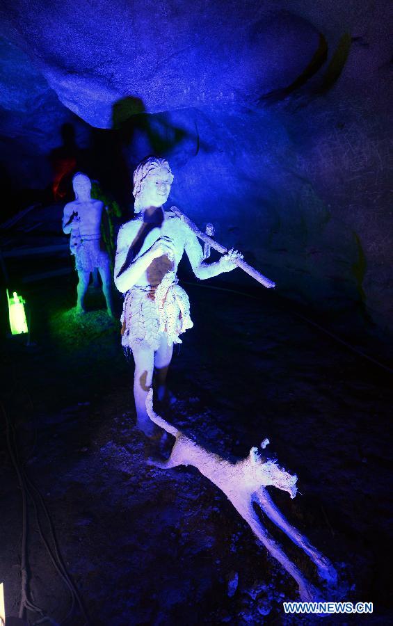 Photo taken on Nov. 26, 2012 shows the sculptures imitating ancient people's hunting life at the Xianren Cave in Dayuan Township of Wannian County, east China's Jiangxi Province. Xianren Cave is the location for historically important finds of prehistoric pottery sherds and rice remains. (Xinhua/Zhou Ke)