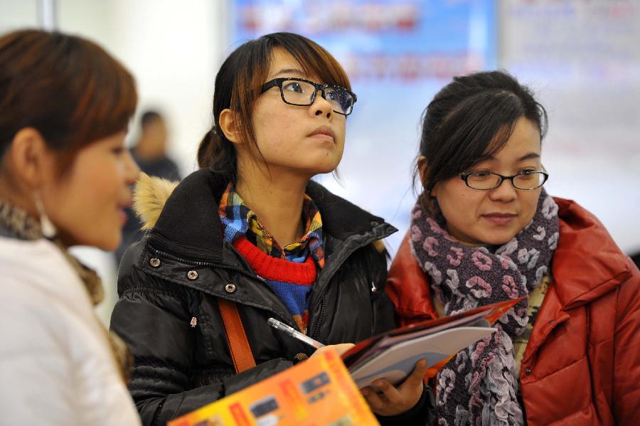College students look at the employment information at a job fair in Jinan, capital of east China's Shandong Province, Nov. 27, 2012. (Xinhua/Guo Xulei)