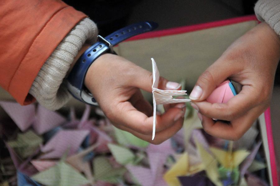A student folds paper cranes at the Red Ribbon School in Linfen City, north China's Shanxi Province, Nov. 27, 2012. A total of 23 students with AIDS receive free medical treatment and eduction at the school. (Xinhua/Wu Di)
