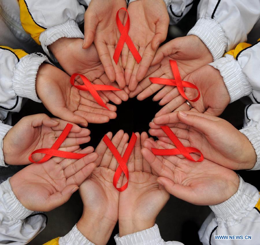Volunteers show red ribbons during an event to mark the upcoming World AIDS Day on Dec. 1 in Chongqing, southwest China, Nov. 30, 2012. (Xinhua/Li Jian)
