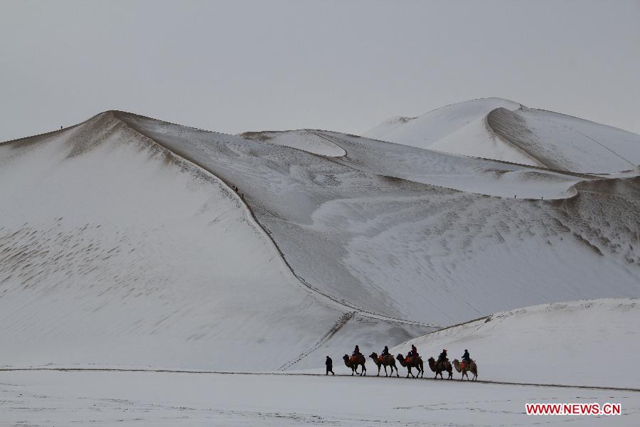 Tourists visit the scenic spot of the Mingsha Mountain and Crescent Moon Lake in Dunhuang City, northwest China's Gansu Province, Dec. 2, 2012. (Xinhua/Zhang Xiaoliang)