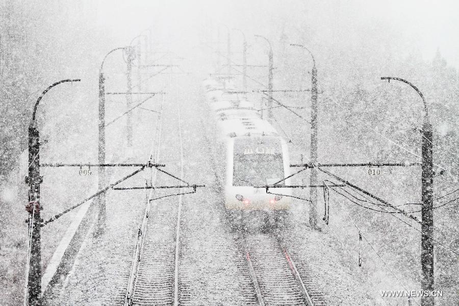 An urban rapid tram leaves Quanshui Station in Dalian, northeast China's Liaoning Province, Dec. 3, 2012. Snow fell in most parts of the northeast of China, and local area had a blizzard. Liaoning Province issued a continuous blizzard warning signal from early Monday morning, while issuing the first alert for the blizzard at Shenyang and other areas. (Xinhua)