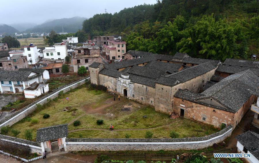 Photo taken on Nov. 22, 2012 shows a walled village in Chebu Village of Dingnan County in Ganzhou City, east China's Jiangxi Province. This clay building was built in 1786, covering an area of 1,300 square meters. The Gannan (southern Jiangxi Province) Hakka walled villages, a special architectural type, was included into China's World Cultural Heritage Tentative List on Nov. 17, 2012. The whole structure of the building resembles a small fortified city, containing halls, storehouses and living areas. It is regarded as the "cradle of Hakka". According to official statistics, there are over 600 such buildings in Gannan at present. (Xinhua/Song Zhenping)