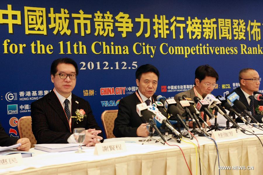 Gui Qiangfang (2nd L), president of China Institute of City Competitiveness, attends a media conference for the release of the 11th China City Competitiveness Ranking by the Institute in south China's Hong Kong, Dec. 5, 2012. The top three Chinese cities of the comprehensive competitiveness ranking are Hong Kong, east China's Shanghai Municipality and China's capital Beijing. (Xinhua/Jin Yi)