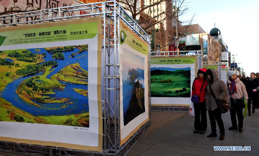 People watch photos presented in the "Beautiful China Civilized Ecology Photographic Exhibition" in the Wangfujing Street in Beijing, capital of China, Dec. 5, 2012. A total of 116 pieces of photo works were on display. (Xinhua/Wu Chenghuan)