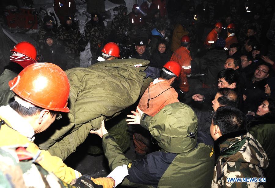 Rescuers carry a rescued miner to an ambulance at the flooded Furuixiang Coal Mine in Qitaihe, northeast China's Heilongjiang Province, Dec. 7, 2012. Four miners who have been trapped in the flooded Furuixiang Coal Mine for more than five days were rescued early Friday morning. Rescuers are still searching for seven others who have been missing after the mine was flooded on Saturday. A total of 22 miners were working underground when the accident occurred. Six miners escaped, with another two escorted out of the mine at noon Sunday. Three miners have been confirmed dead. (Xinhua/Qin Cunguang)