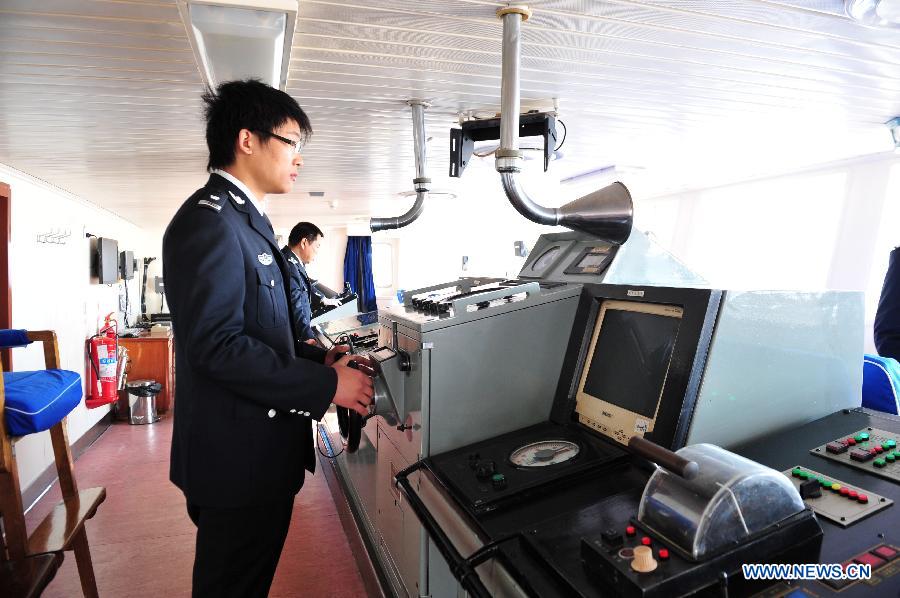 Sailor Zhang Lixiang steers the Chinese fishery patrol ship "Yuzheng 206" in east China's Shanghai, Dec. 11, 2012. The 5,800-tonne ship was sent to the East China Sea on its maiden voyage on Tuesday to protect the fishing activity. (Xinhua/Zhang Jiansong)