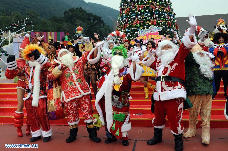 Actors dressed as Santa Claus and cartoon characters perform during Christmas party at the Ocean Park in Hong Kong, south China, Dec. 11, 2012. (Xinhua/Zhao Yusi)