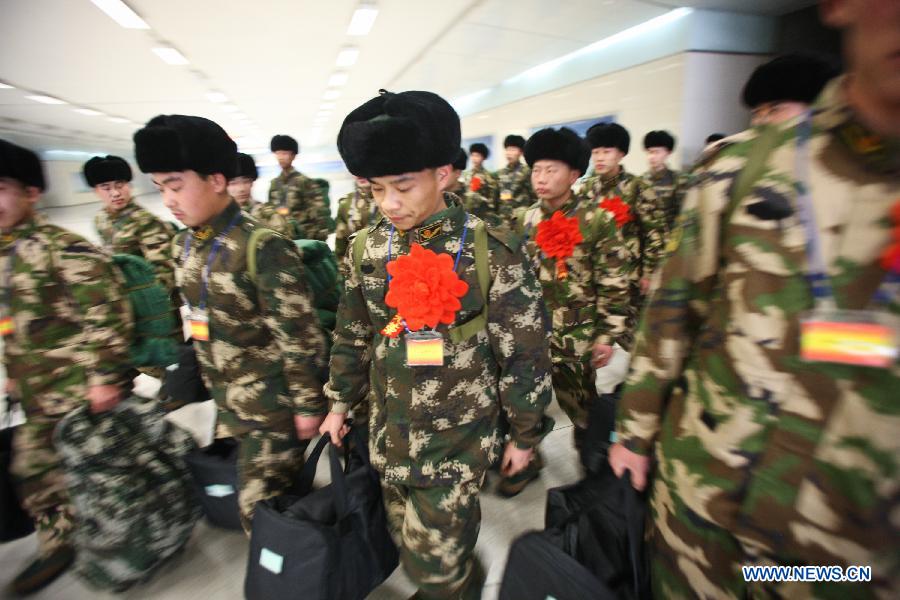 Newly recruited para-military policemen get off a train at a railway station in Hohhot, north China's Inner Mongolia Autonomous Region, Dec. 12, 2012. Newly recruited soldiers of People's Liberation Army (PLA) and para-military policemen joined their units around the country recently. (Xinhua/Zhang Fan)