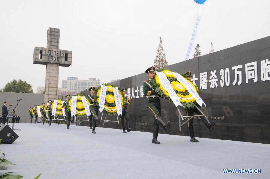 Soldiers present wreaths during a memorial ceremony at the Memorial Hall of the Victims in Nanjing Massacre by Japanese Invaders in Nanjing, capital of east China's Jiangsu Province, Dec. 13, 2012, to mark the 75th anniversary of the Nanjing Massacre. Nanjing was occupied on Dec. 13, 1937, by Japanese troops who began a six-week massacre. Records show more than 300,000 Chinese unarmed soldiers and civilians were killed. (Xinhua/Shen Peng)