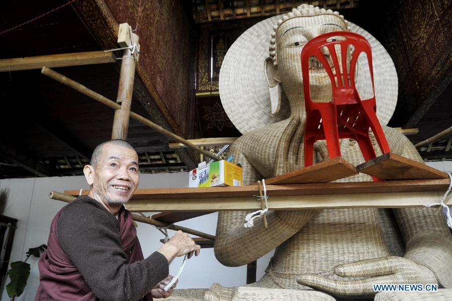 A monk weaves with bamboo to make a Buddha statue at a Dai folk custom park in Menghan township of Xishuangbanna Dai Autonomous Prefecture, southwest China's Yunnan Province, Dec. 9, 2012. In the town teeming with bamboos, local poeple take advanctage of the bamboo weaving handicraft to develop tourism. (Xinhua/Hao Yaxin)