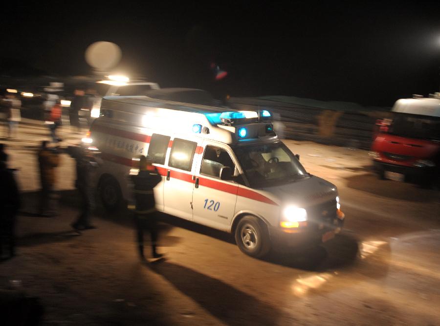 An ambulance with survived workers leaves a railway tunnel in Lanzhou, capital of northwest China's Gansu Province, Dec. 14, 2012. Five construction workers who were buried in a tunnel that was under construction around 2:50 p.m. on Wednesday were rescued at 10:07 p.m. Friday. (Xinhua/Nie Jianjiang)